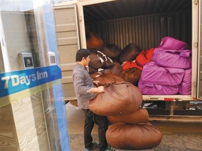 3月20日,7天连锁酒店(北京鸟巢体育场店)门口,丰台区大灰厂村的洗涤厂工人将待洗的布草搬运上车。
