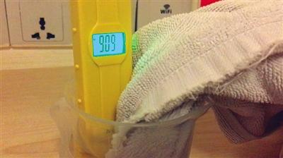 在量杯中倒入250ml的蒸馏水,PH测试笔上数字显示为5.48。记者将一袋浴巾拆封,把浴巾的一角浸入蒸馏水中,一分钟后,PH测试笔上的数字显示为9.09。