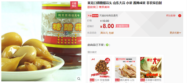 图为天猫首席食品专营店销售的标称山东莱芜泰顺斋食品有限公司生产的糖醋蒜截图