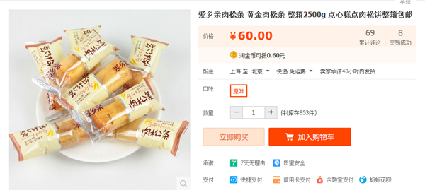 图为淘宝华东食品联盟销售的标称福建爱乡亲食品股份有限公司生产的肉松条截图