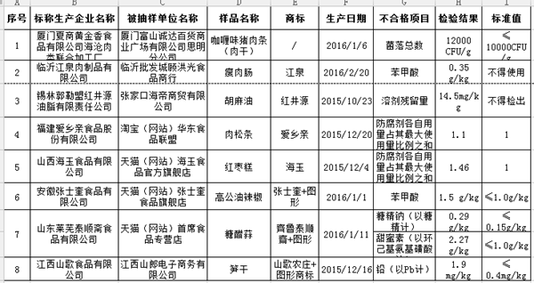 新华网北京5月4日电(李楠)5月3日晚,国家食药监总局公布新一期食品抽检名单,8批次食品样品因抽检不合格被通报。其中,4批次来自天猫淘宝等食品旗舰店的食品不符合食品安全国家标准。不合格食品涉及高公油辣椒、糖醋蒜、肉松条和红枣糕等,防腐剂、甜蜜素、苯甲酸等超标为其不合格主要原因。
