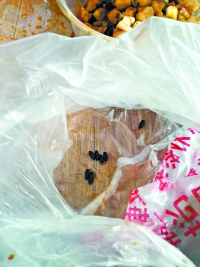 吴女士经常在大鸭梨餐厅马家堡分店用餐,她也多次通过美团叫这家餐厅的外卖到家里。昨天一直在下雨,考虑到外出用餐不方便,于是,她就订了两道家常菜。送餐员冒着雨送来后,吴女士看着和往常不一样的包装袋,心里就有了一点小疑惑。往常,大鸭梨餐厅的打包袋,上面都有餐厅的标志和电话,昨天送来的却是一个印着“北京超市专用袋”的普通塑料袋。打开袋子,里面没有点餐小票,把盛菜的餐盒拿出后,袋子底部露出来的七八个深棕色的颗粒让吴女士一惊。后来,经过仔细辨认,她大惊失色,这些居然都是虫卵!