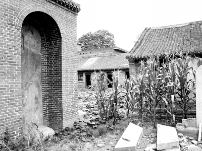 院内,数通石碑暴露在日晒雨淋中,有的被丛丛玉米遮挡。记者屏息凑近一通石碑,就着暮色依稀辨识出额首上的文字“敕赐伊川书院之碑”。此碑为元代所立,碑文由楷书四大家之一的赵孟頫书写,可而今,碑体上的大片文字已经漫漶莫识。而其余大部分石碑,上面的文字经风雨剥蚀,也已模糊不清,有些甚至变成无字碑。很多碑体上,粗劣的水泥拼接痕迹让人触目惊心。
