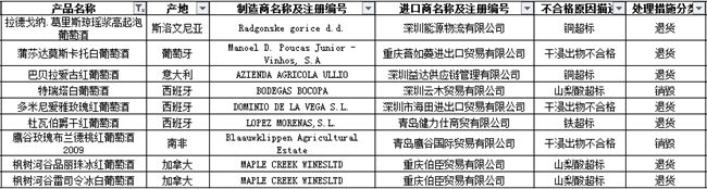 此外,西班牙的特瑞塔白葡萄酒、加拿大的枫树河谷品丽珠冰红葡萄酒、枫树河谷雷司令冰白葡萄酒被检出山梨酸超标;西班牙的杜瓦伯爵干红葡萄酒被检出铁超标;意大利的巴贝拉爱古红葡萄酒、斯洛文尼亚的拉德戈纳.葛里斯琼瑶浆高起泡葡萄酒被检出铜超标。
