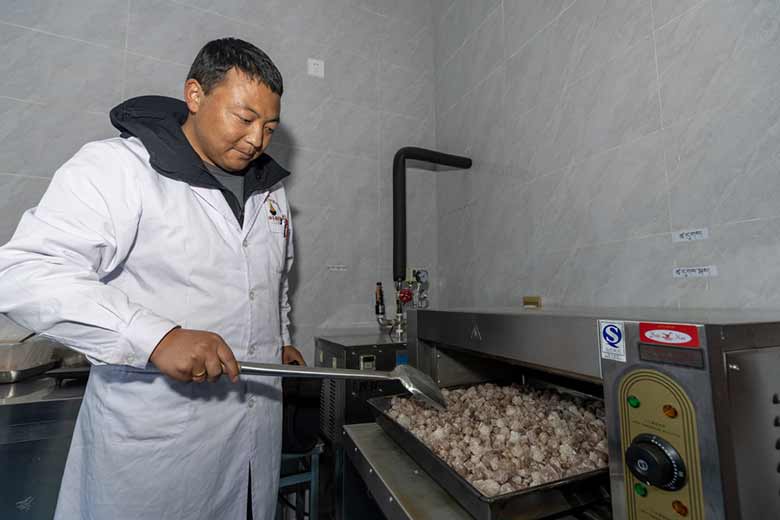 村民索朗美朵自公司成立起就在此工作,是一名包装工,“有了稳定收入,还能照顾家庭,明年准备重建房子”。