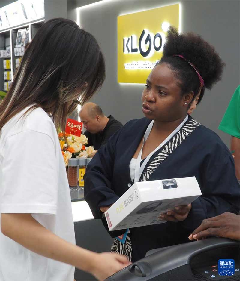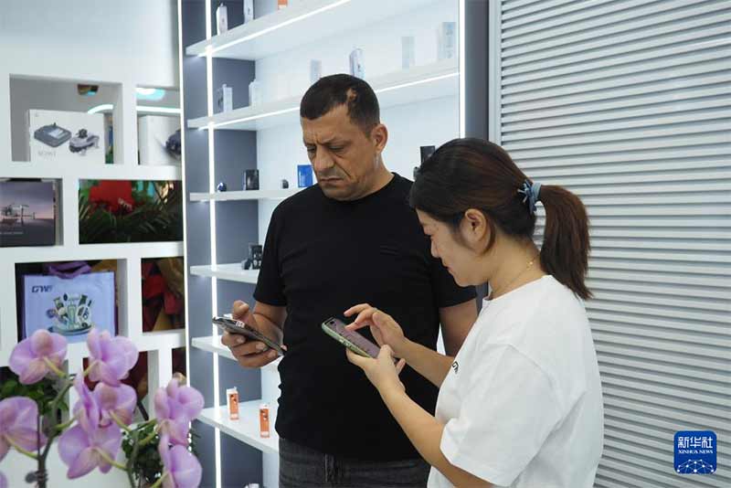 10月14日,外籍客商在义乌全球数贸中心一店铺内购买电子产品。新华社记者 刘梓漪 摄
