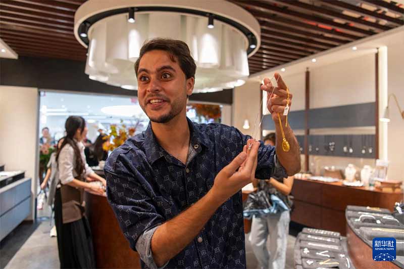 10月14日,外籍客商在义乌全球数贸中心选购珠宝饰品。新华社发(胡肖飞摄)