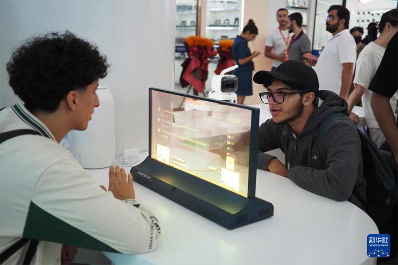 10月14日,外籍客商在义乌全球数贸中心与机器人互动。新华社发(胡肖飞摄)