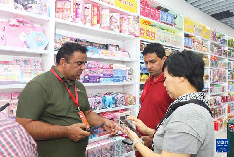10月14日,巴基斯坦客商在义乌全球数贸中心采购玩具。新华社发(龚献明摄)