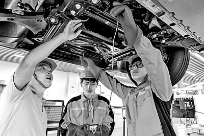 安徽省芜湖市繁昌区芜湖机械工程学校实训基地,学生学习新能源汽车检测与维修知识。肖本祥摄/光明图片