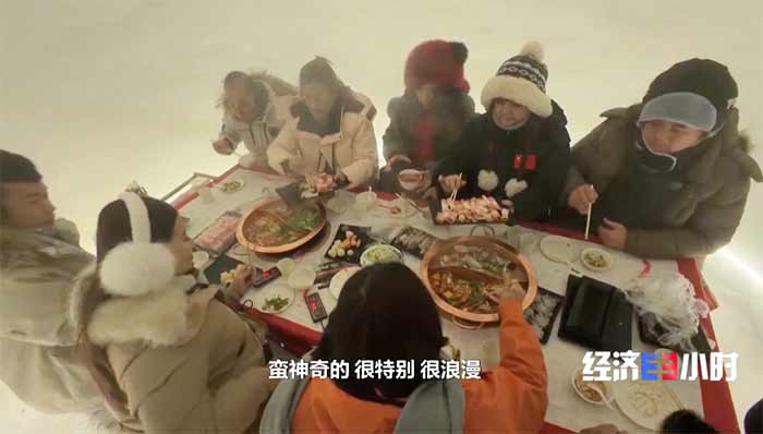 游客们在冰天雪地里漂上一程,一上岸,就奔向特色雪屋。在这里享用热气腾腾的火锅,体验“冰火两重天”的乐趣。