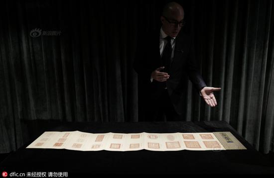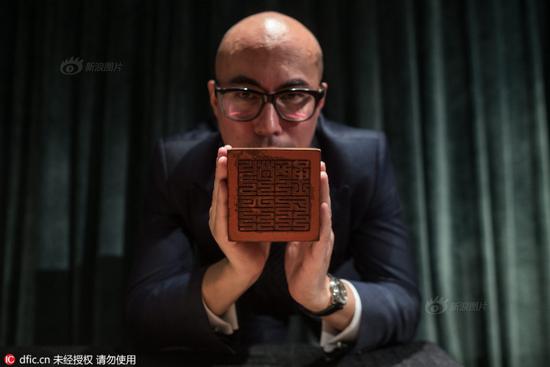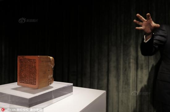 3月14日,香港苏富比亚洲区副主席仇国仕展示康熙帝御宝“敬天勤民”檀香木异兽钮方玺,该玺将于4月6日中国艺术品春拍期间拍卖,起拍价估计为1500万美元。供图:东方IC