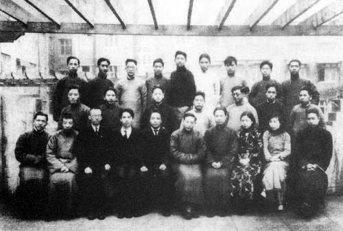 李公朴与《申报》流通图书馆、补习学校全体同人合影,前排右五为李公朴,左四为夏征农,左五为艾思奇。