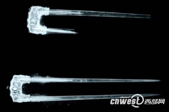 这四把钗,钗首和钗脚中空,透过X光发现两部分通过两根管状物连接。经过进一步的提取分析,文物工作者分析,应该为木销。为了让钗首和钗脚插得更加紧密,当时的工匠在木销上包裹了棉花。在一千多年后的今天,文物工作者用镊子将这些棉花轻轻向外拉拽,还略感吃力。扬州地处湿润的江南地区,木制品和棉织品难以保存,所以扬州市考古所所长束家平分析,这也与铜钗密封的严密有关。