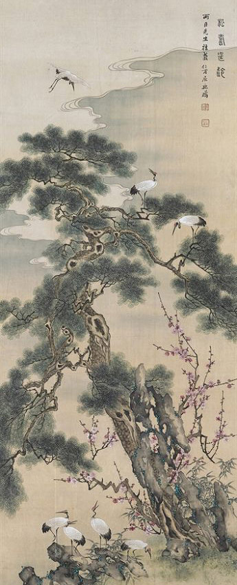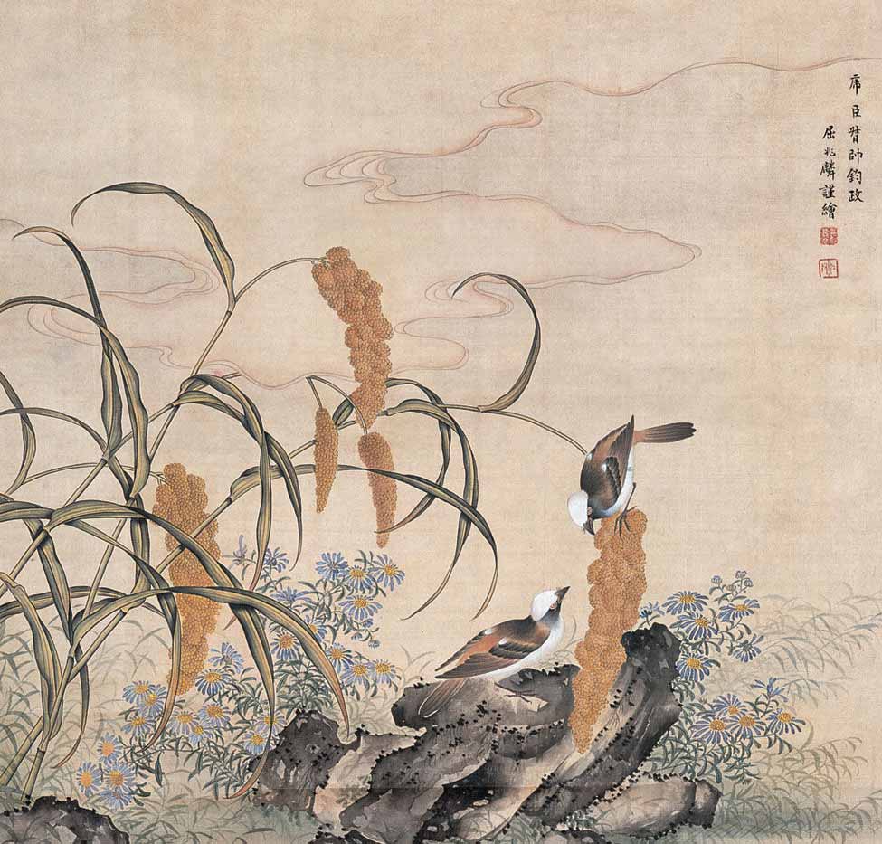 屈兆麟对花鸟、山水、人物无一不精,尤善松鹤。在如意馆,画工们绝不可随心所欲地去画泼墨的大写意画,也不能在画的内容上掺杂个人的意念,所画内容受到严格的限制,因此,屈兆麟当年在宫内画的大都是寓意长寿的松柏、仙鹤、灵芝草、蝙蝠、寓意如意的菊花、象征雍容华贵的牡丹、多子多福的石榴等,这些题材的画作深得慈禧赏识,常由他代笔作画以赏赠大臣。他的工笔画水平不弱于郎世宁,因此遵皇帝之嘱,常仿郎世宁的作品。