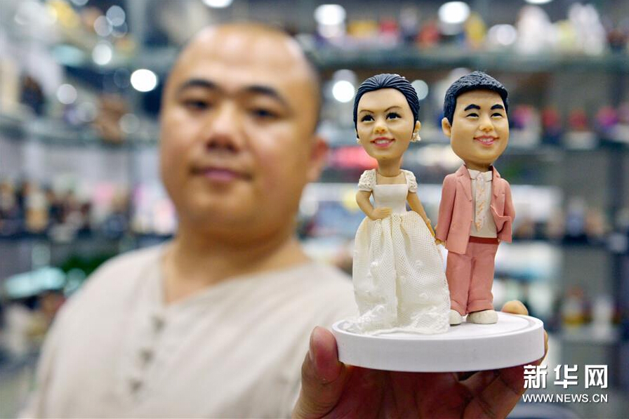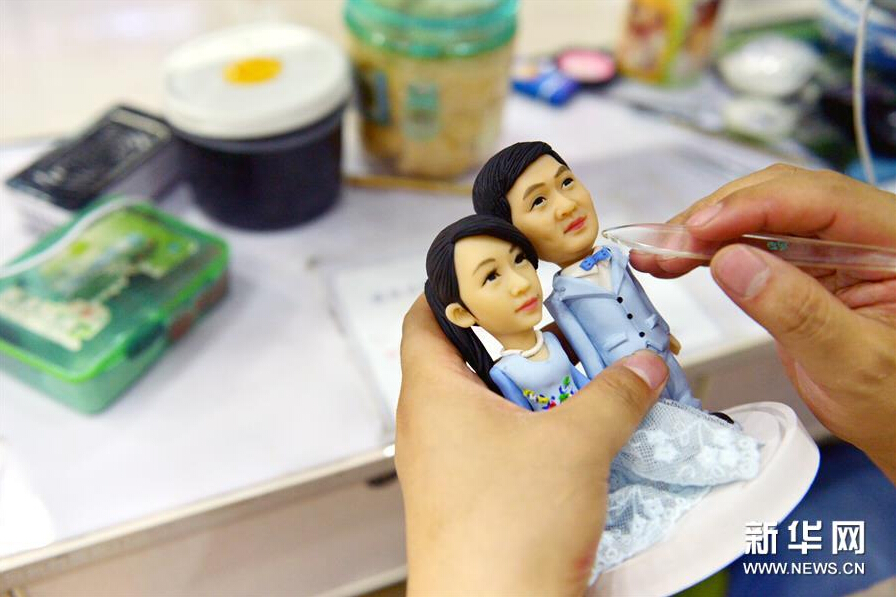 七夕将至,山东聊城面塑艺人孙景昌制作的“面塑情侣”走俏,这种带有中国元素和民俗文化的“面塑情侣”赢得不少年轻人的青睐。新华社发(孔晓政 摄)