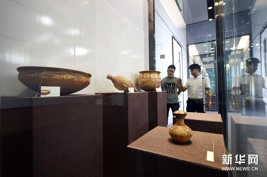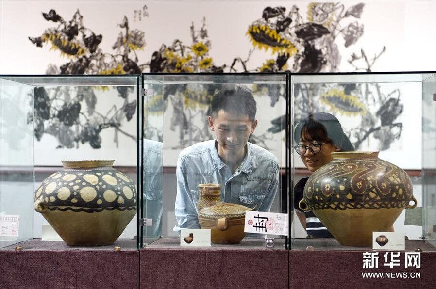 8月10日,参观者在欣赏展出的彩陶