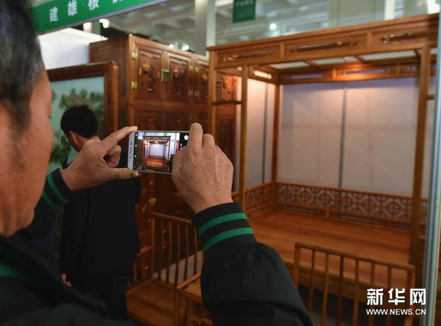 (3)10月9日,一位参观者在拍摄核桃木制作的家具。