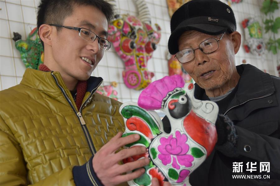 87岁的泥塑国家级传承人胡深在指导小孙子胡九龙做泥塑。新华社记者都红刚摄