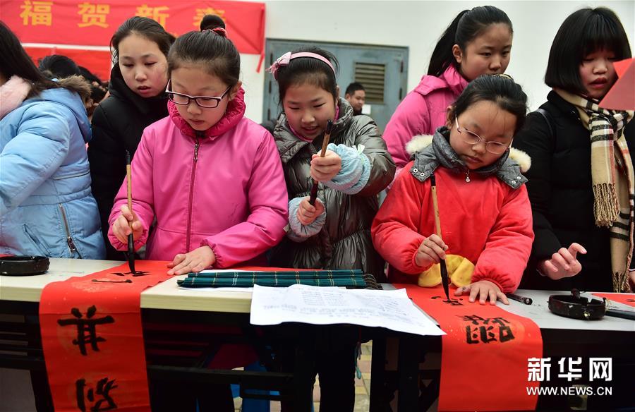 2017年1月17日,安徽合肥市多个社区开展“新春送祝福”活动,邀请书法爱好者、剪纸艺人为辖区居民、农民工等送去春联和剪纸作品,营造欢乐祥和的氛围。新华社记者 刘军喜摄