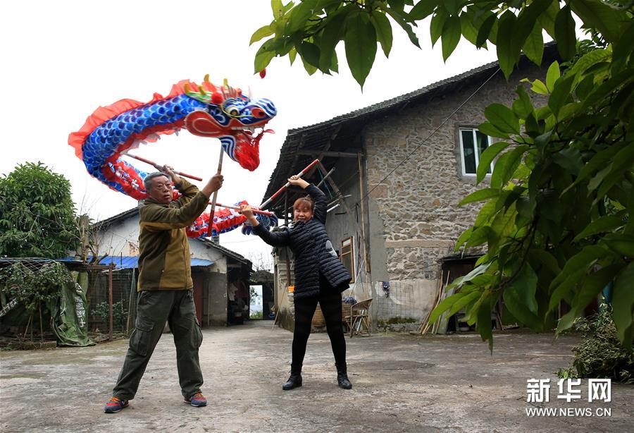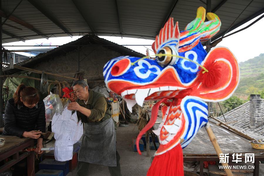 (2)2月18日,在重庆市北碚区偏岩古镇,唐门彩扎传承人唐亁太(左)舞动刚制成的一条彩扎龙作品。