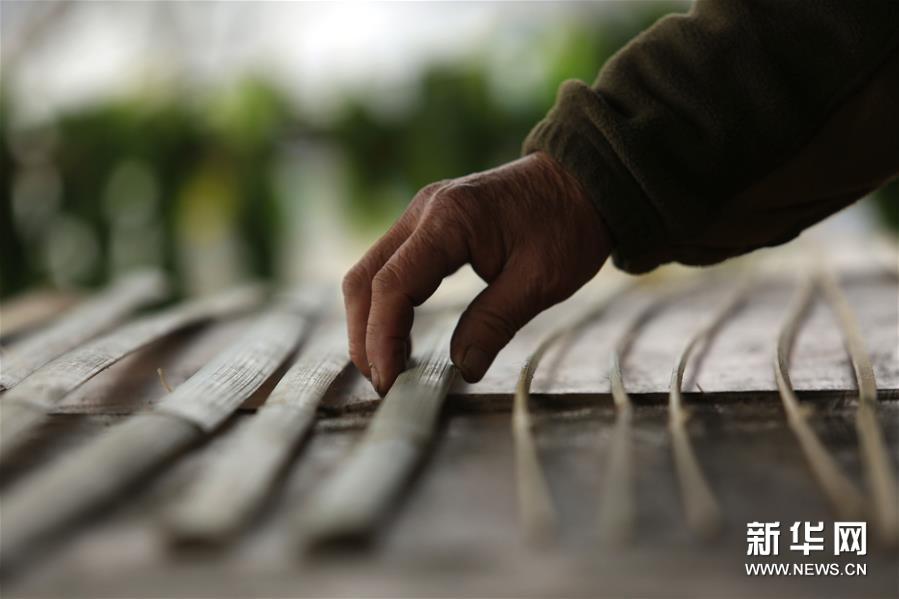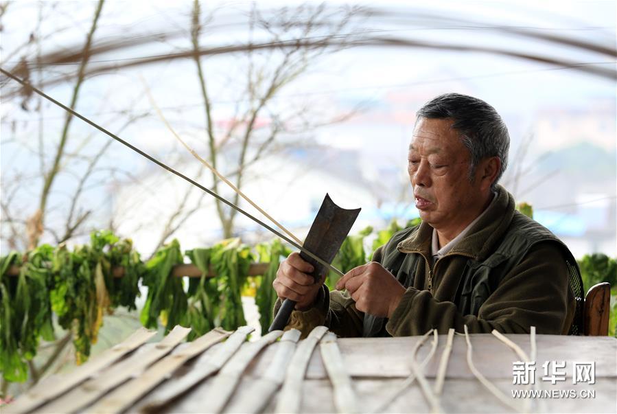(4)2月18日,在重庆市北碚区偏岩古镇,唐门彩扎传承人唐亁太为篾条去黄皮,准备扎制。