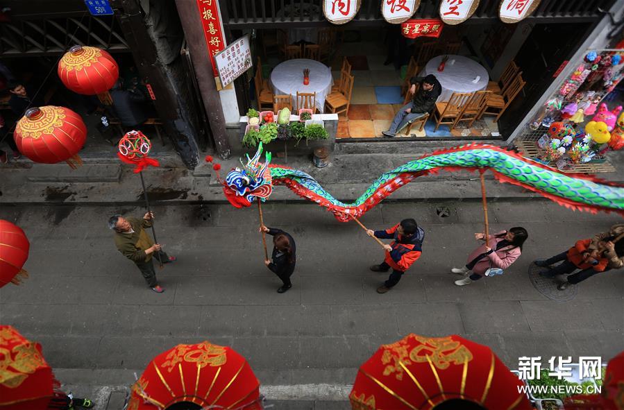 (7)2月18日,在重庆市北碚区偏岩古镇,唐门彩扎传承人唐亁太(左一)向市民传授舞龙技巧。