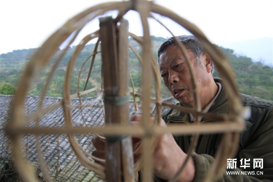 (8)2月18日,在重庆市北碚区偏岩古镇,唐门彩扎传承人唐亁太在用篾条扎制作品。