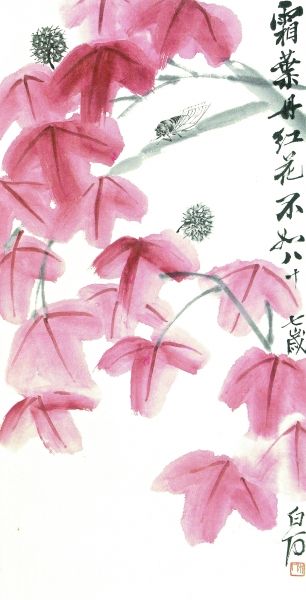 目前可以见到的齐白石最早的草虫画是1894年画的《草叶蛾子》,属款“三百石印富翁”,是典型的金农体,印章也是早期的常用印“木居士”。此外,1902年“沁园师母命画”的《花卉蟋蟀》团扇,蟋蟀十分工细,花卉以没骨画法画出。这一时期的花卉也是工笔居多,色彩还不亮丽,有些画作落款书法是金农体,明显是齐白石的早期草虫画风格。在1920年未变法前,齐白石还曾经以八大山人的冷逸画法画过一段时间的写意草虫花卉,纯用水墨,用笔简率,构图舒朗,但在当时并不受欢迎,后来就基本弃之不画了。