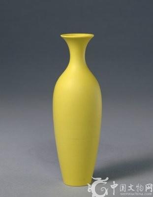 淡黄釉瓶,清雍正,高14.6cm,口径3.3cm,足径1.7cm。瓶撇口,细颈,溜肩,肩下渐敛,圈足。通体及足内施淡黄釉。外底暗刻篆书“大清雍正年制”三行六字款。