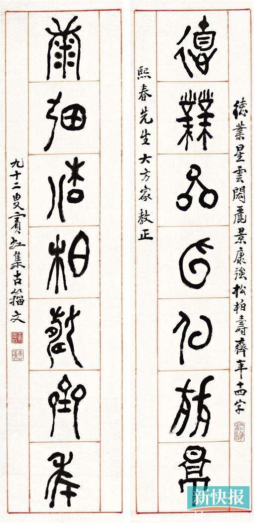 ■黄宾虹 1955年作 金文七言联 雅昌供图 释文:德业星云闳丽景,康强松柏寿齐年。德业星云闳丽景,康强松柏寿齐年,十四字。熙春先生大方家教正,九十二叟宾虹集古籀文。 此金文对联为黄宾虹92岁晚年墨迹,书作老气纵横,墨重笔拙,字法参差生奇,堪称其暮年书法的代表作。