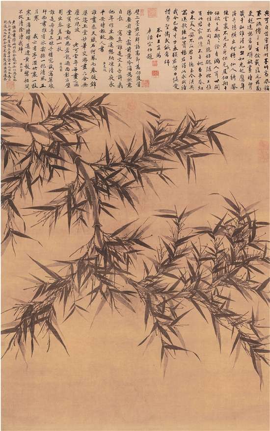 《墨竹图轴》是“墨竹画”宗祖文同的存世代表作,文同(1018~1079)字与可,自号笑笑先生、锦江道人,世称石室先生。本幅画一竿悬崖倒垂竹,墨竹作弯曲状,由左上斜向右下方,竹叶以浓墨为面,淡墨为背,阴阳向背层次分明,开后世墨竹之先河。