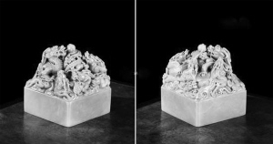 此田黄玺印出自著名工艺美术大师郭祥忍之手,郭祥忍充分发挥石材的质地颜色进行创作,在印台之上雕刻九头姿态各异的苍龙,彼此的结构丰富中不乏呼应,彼此均聚焦于印钮顶部白色巧雕的圆珠,构思与工艺精奇。正方印章巨大的体量,尚佳的质色,精美的雕工,无一不是世所罕见,而这些特质完美地融于一石更见难得。