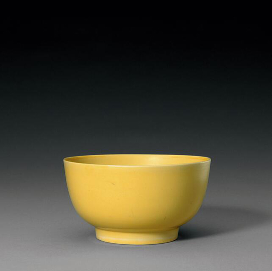 此碗造型规整,堪称传世弘治御窑浇黄釉碗中形体最大者。原藏紫禁城内廷西路养心殿后寝殿之东耳房“体顺堂”内一木箱中,此堂是宫内存贮弘治、正德两朝御窑瓷器最多之处,仅存放于堂内几个大木箱中的各式弘治、正德朝浇黄釉碗等就有139件。此碗虽不署款,但从造型和胎釉特征看,非弘治朝景德镇御窑产品莫属。