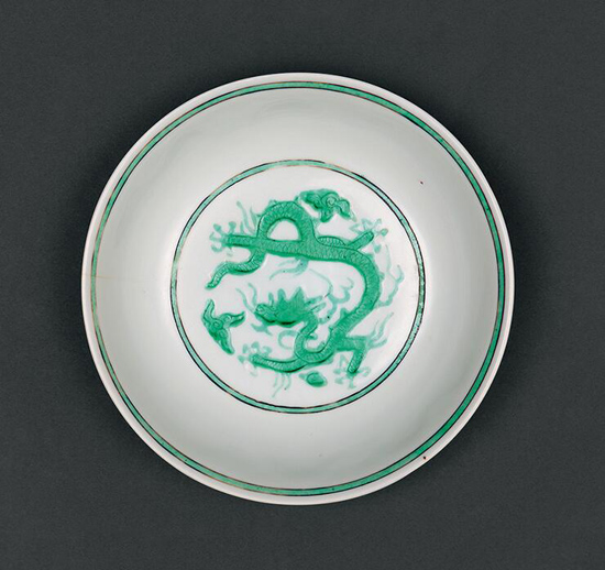 盘撇口、浅弧壁、圈足。内、外白地绿彩装饰。内底和外壁均饰绿彩锥拱云龙纹,隙地锥拱海水江崖纹。釉上绿龙鲜艳夺目,釉下海水隐约可见。圈足内施白釉。外底署青花楷体“弘治年制”四字双行外围双圈仿款。