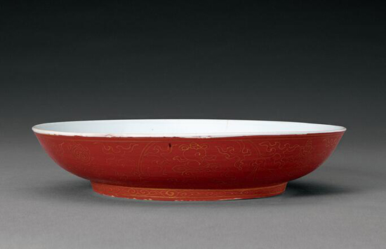 盘敞口、浅弧壁、浅圈足。内施白釉,无纹饰。外壁矾红地上以金彩描绘缠枝莲托八吉祥纹。圈足内施白釉。外底锥拱楷体“弘治年制”四字双行外围双圈仿款。