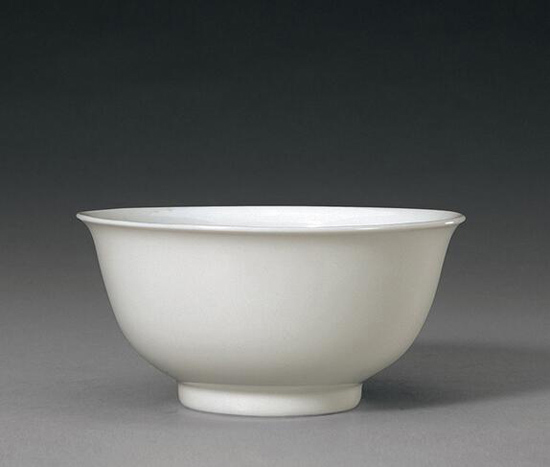 碗撇口、深弧壁、圈足。内、外和圈足内均施白釉,足端不施釉。内壁锥拱云龙纹。外底署青花楷体“大明弘治年制”六字双行外围双圈仿款。此碗造型小巧秀美,胎体坚质细腻,釉色洁白如雪,素雅恬净。所锥拱云龙纹,若隐若现,线条纤细如发丝,堪称康熙朝白釉瓷中的上乘之作。