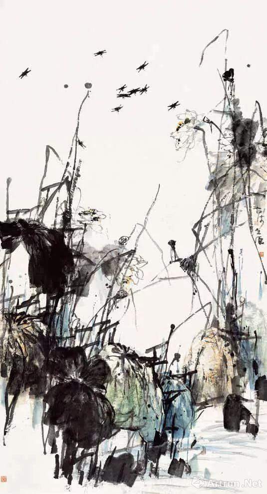 于是他回答:“《秋荷图》的荷叶、荷杆画法,我是依据吴昌硕先生‘画气不画形’的观念来处理的,使笔‘从意’而不‘从形’。故而中国画的造型既有物理形象,也有笔墨意象,也就是我们常说的“似与不似’之间。”