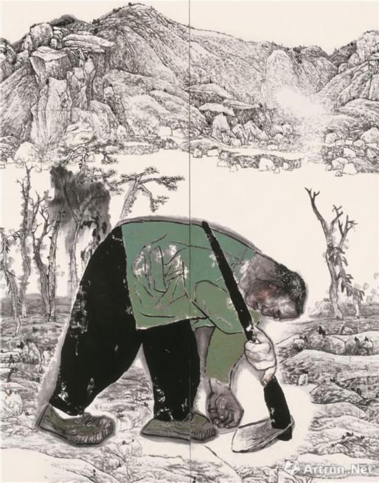 袁武《在朱耷山水上耕种》340×340cm 宣纸水墨 2011年