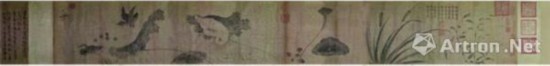 宋徽宗《池塘秋晚图》。形式:卷。尺寸:33×237.8厘米。宋徽宗(1082—1135),姓赵名佶,能诗、善书画。此件以荷鹭为主体,将各种动、植物分段安排在画面上,古雅可爱,以写意笔法描绘写实造型,符合徽宗的粗笔风格。全卷用纸张为砑花粉笺,表面皆有涂布,其上再砑以典雅的卷草纹饰,纹饰上还涂有云母状的发光物质,最后印压出织品的横斜纹路,代表宋代制作工艺最高等级的加工纸。砑花笺纸多为书写用,作画相当罕见,纸面上的粉稍稍影响到笔墨表现,线条呈现出砑花笺书写的斑驳感与墨趣。