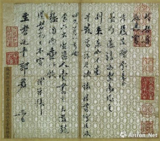 宋苏轼《致至孝廷平郭君尺牍》。形式:册。尺寸:26.5×30.5厘米。“孝履”指居丧期间的起居行止,言明郭廷平正在守丧期间,据内容推测约书于熙宁八年(1075)。书法属早期秀丽风格,用笔讲究,线条流畅丰润。此札书于满饰龟甲纹的粉笺上,六角形龟甲纹中皆有一只小乌龟,东传至日本后成为流行纹饰,有时乌龟还被简化成小花,然在中国书写用纸上反而少见。尽管守丧期间一切讲究朴素,苏轼却使用了外观颇为精美的龟甲纹砑花笺,考虑古代龟型墓志铭上亦饰有龟甲纹,或许纹饰本身的含意能切合礼节。另有苏轼《致运句太博尺牍》、 苏轼《致长官董侯尺牍》。