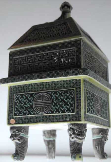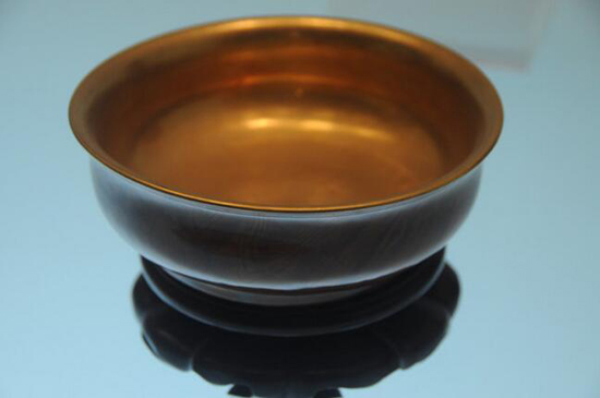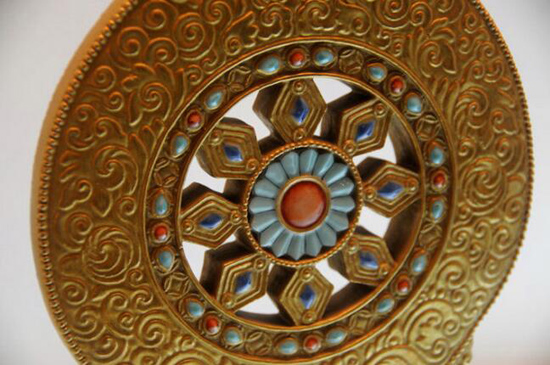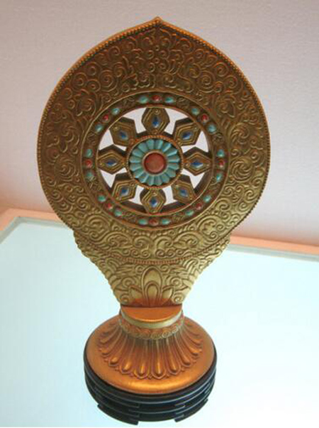 法轮是佛家八宝之一,象征佛法永不熄灭,像轮子一样旋转不停。此器施金釉,饰珐琅彩。中央八根菱形轮辐代表佛祖释家牟尼一生传教的八件大事。