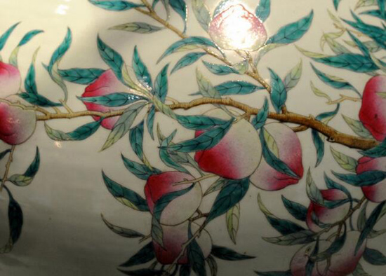 粉彩寿桃纹天球瓶(纹饰细节图) 清道光