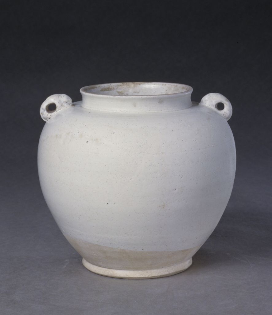 白釉兔系罐,唐,口径10.5cm,底径10.3cm,高17cm。