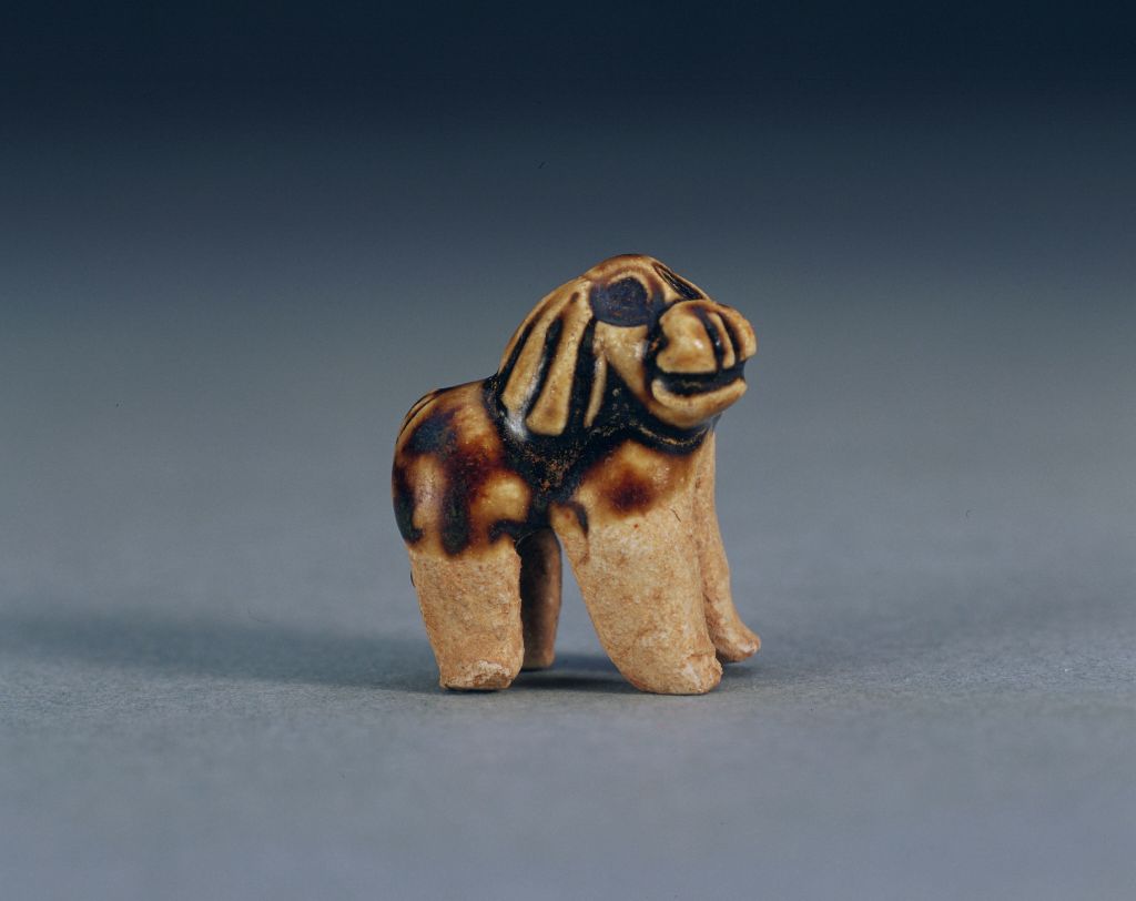 小狗半施黑釉,昂首直立,双眼圆睁,身上毛发雕刻清晰。唐代瓷塑作品以动物和人俑居多,这件唐代黑釉狗耸鬃卷尾,表达出鲜明的力度和传神的意趣。