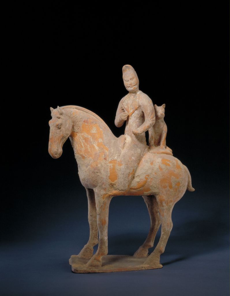 红陶骑马狩猎俑,唐,高35cm