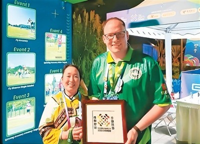 刘小林(左)和购买她刺绣作品的外国运动员合影。本文作者供图