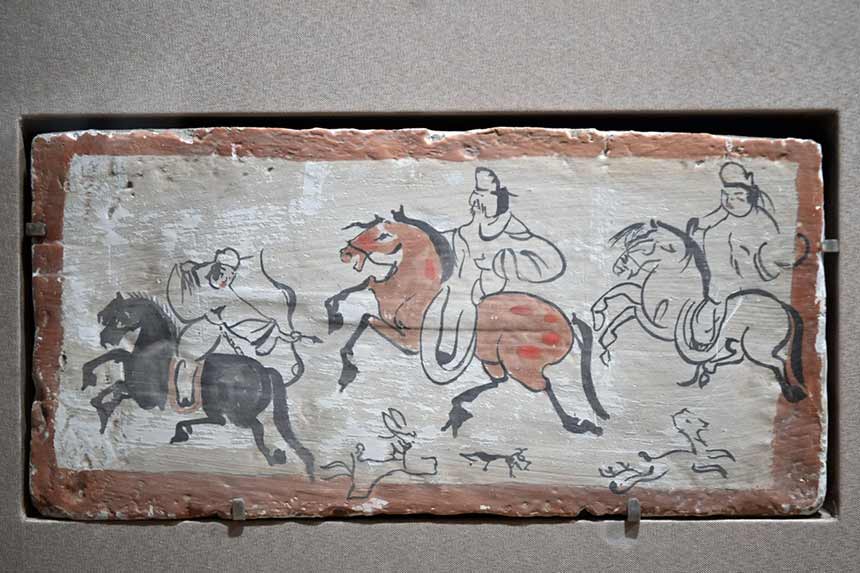 张掖市高台县博物馆内展出的狩猎图壁画砖。