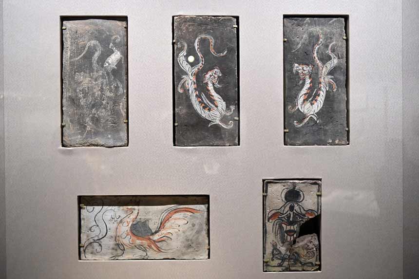 张掖市高台县博物馆内展出的彩绘壁画砖。