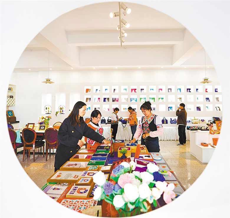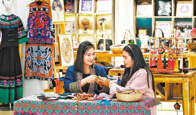 12月3日,楚雄州大姚云彩文化发展有限公司负责人李彩云(左)和绣娘交流技艺。在企业带动下,越来越多的农村妇女加入绣娘行列,专职绣娘人均年收入达3万元至5万元。